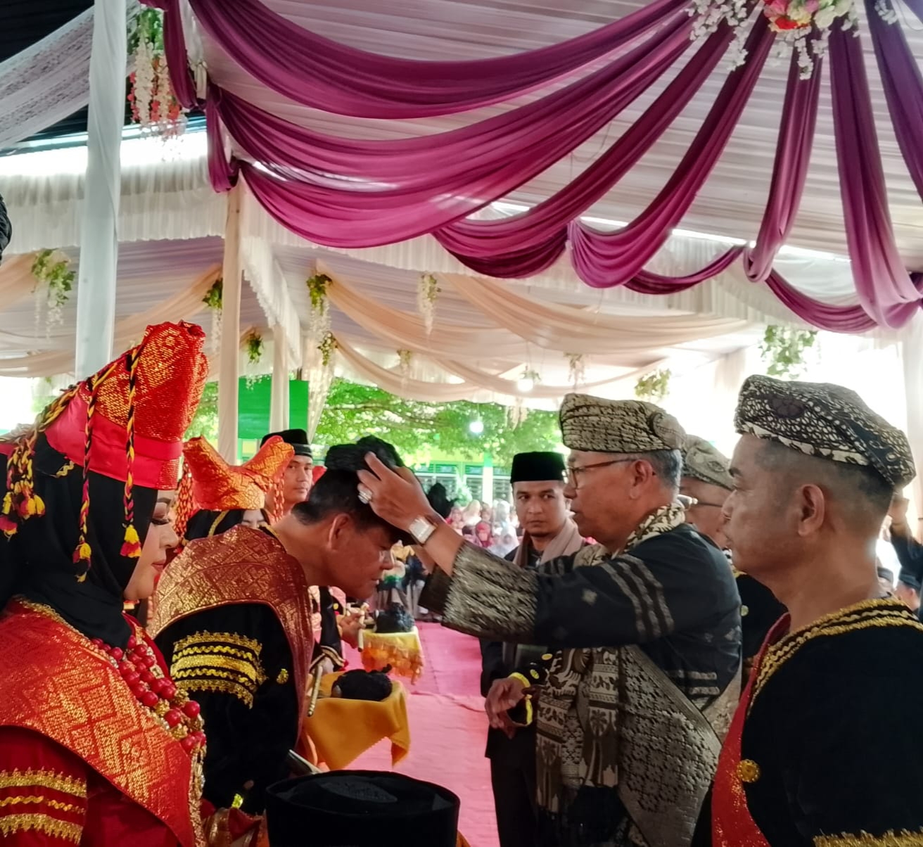 Prosesi sakral tersebut menandai amanah besar yang kini diemban Eriswandi sebagai pemimpin adat dalam kaum persukuan Chaniago. Mengenakan pakaian adat Minangkabau lengkap—deta, baju hitam, sarawa, sesamping, cawek, sandang, keris, hingga tungkek—ia menjalani seluruh rangkaian adat dengan khidmat.