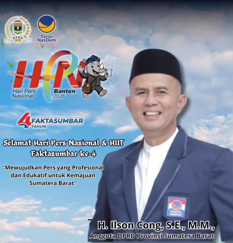 Payakumbuh || Anggota DPRD Provinsi Sumatera Barat, H. Ilson Cong, S.E., M.M., Dt. Mongguang, menyampaikan ucapan selamat memperingati Hari Pers Nasional (HPN) 2026 yang dipusatkan di Banten dan jatuh pada 9 Februari 2026, sekaligus Ulang Tahun ke-4 media Faktasumbar.