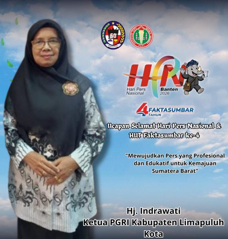 Limapuluh Kota || Ketua Persatuan Guru Republik Indonesia (PGRI) Kabupaten Limapuluh Kota, Hj. Indrawati, menyampaikan ucapan Selamat Hari Pers Nasional (HPN) 2026 sekaligus Selamat Ulang Tahun ke-4 media Faktasumbar.