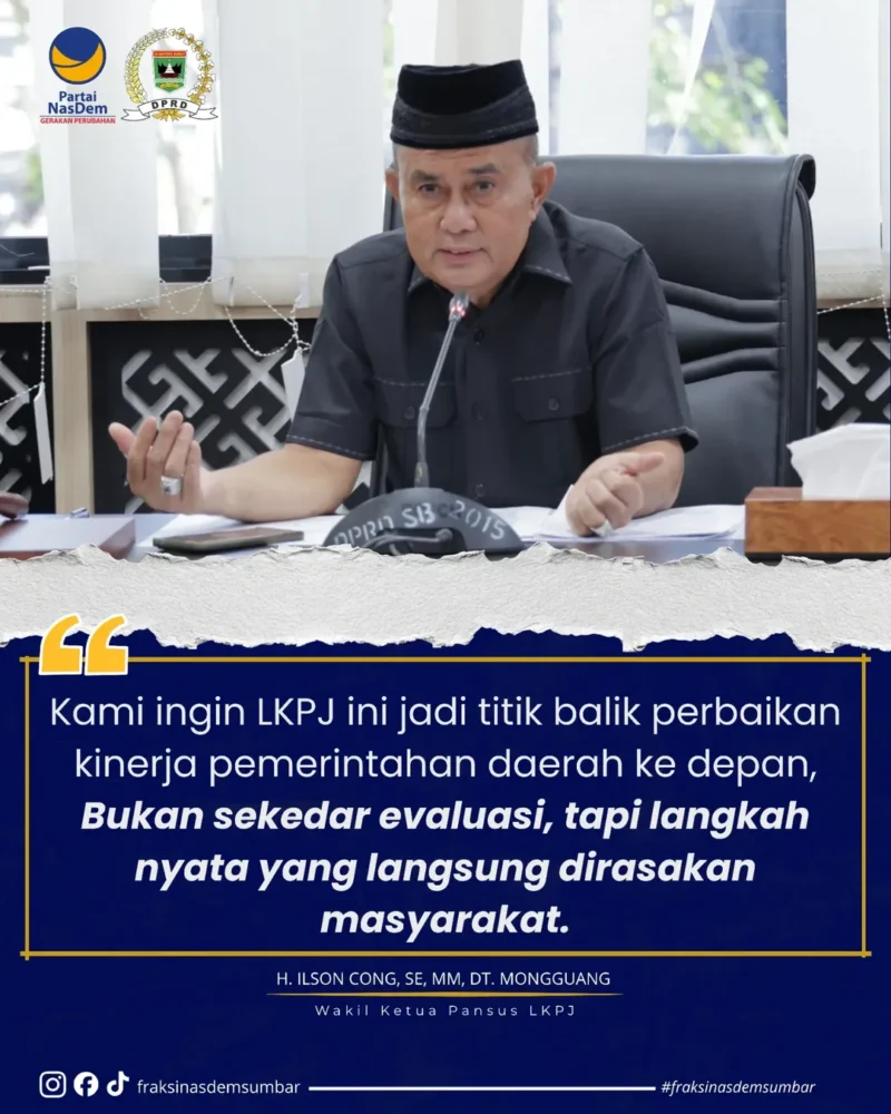 Padang — Sorotan tajam datang dari DPRD Provinsi Sumatera Barat. H. Ilson Cong,SE.MM,Dt.Mongguang. menegaskan bahwa Laporan Keterangan Pertanggungjawaban (LKPJ) Kepala Daerah Tahun Anggaran 2025 tidak boleh lagi hanya menjadi dokumen formal tanpa dampak nyata.