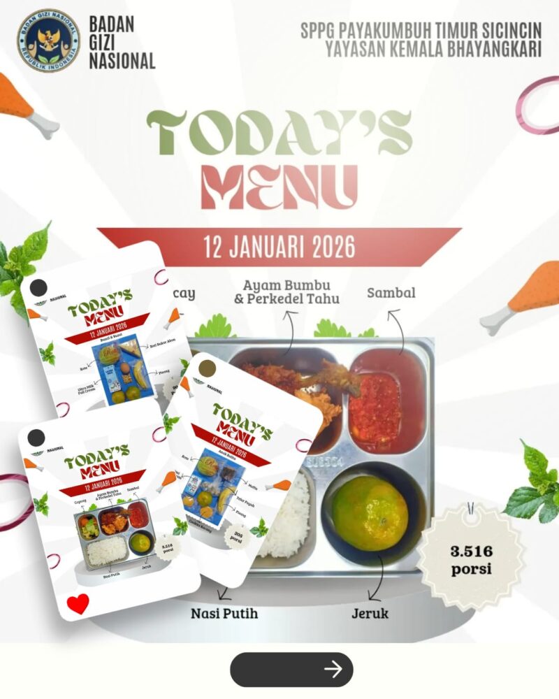 PAYAKUMBUH || Program Makan Bergizi Gratis (MBG) kembali dilaksanakan di wilayah Payakumbuh Timur pada Senin, 12 Januari 2026. Program ini menjangkau sebanyak 3.516 penerima manfaat, dengan sasaran peserta didik, ibu hamil, ibu menyusui, serta anak balita.