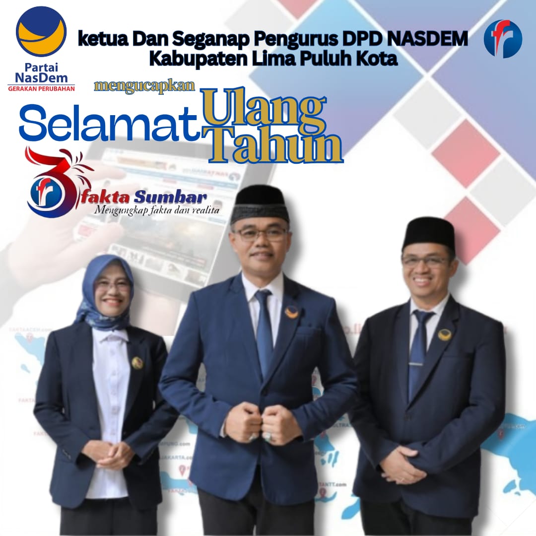 Lima Puluh Kota || Wakil Ketua Dewan Perwakilan Rakyat Daerah (DPRD) yang juga Ketua DPD Partai Nasdem Kabupaten Limapuluh Kota, Alia Efendi Dt. Bijayo Nan Mudo, menyampaikan ucapan selamat ulang tahun ke-3 kepada media Online faktasumbar.id, yang selama ini telah menjadi salah satu mitra strategis dalam menyampaikan informasi dan aspirasi masyarakat Sumbar, khususnya di luak50.