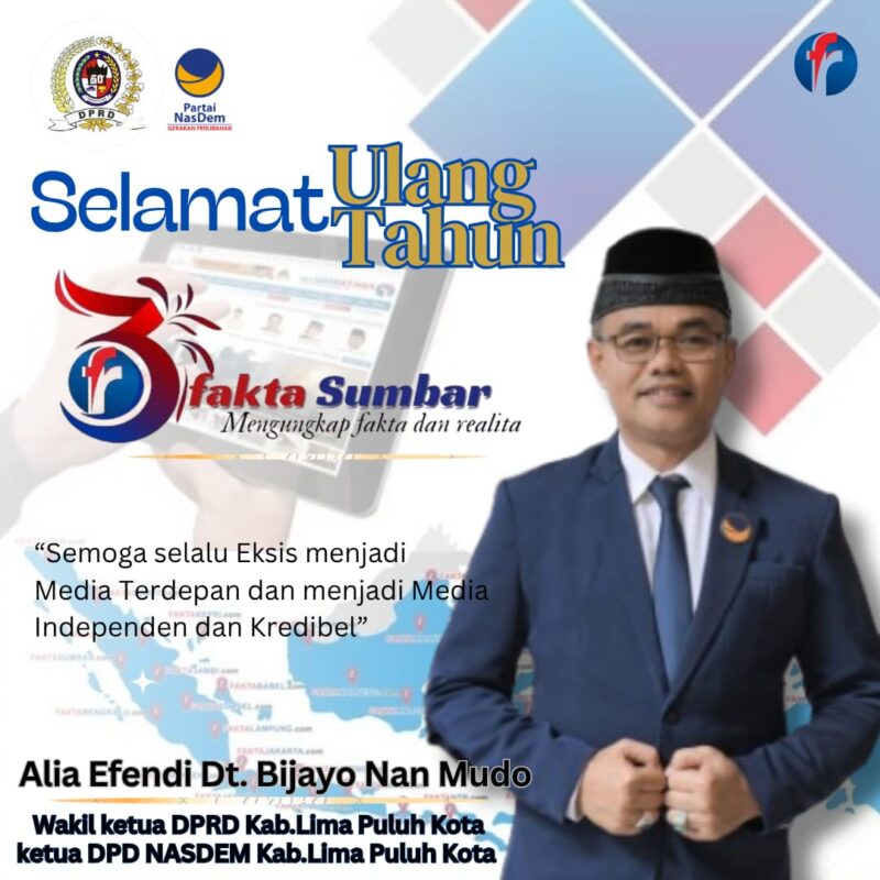 Lima Puluh Kota || Wakil Ketua Dewan Perwakilan Rakyat Daerah (DPRD) yang juga Ketua DPD Partai Nasdem Kabupaten Limapuluh Kota, Alia Efendi Dt. Bijayo Nan Mudo, menyampaikan ucapan selamat ulang tahun ke-3 kepada media Online faktasumbar.id, yang selama ini telah menjadi salah satu mitra strategis dalam menyampaikan informasi dan aspirasi masyarakat Sumbar, khususnya di luak50.